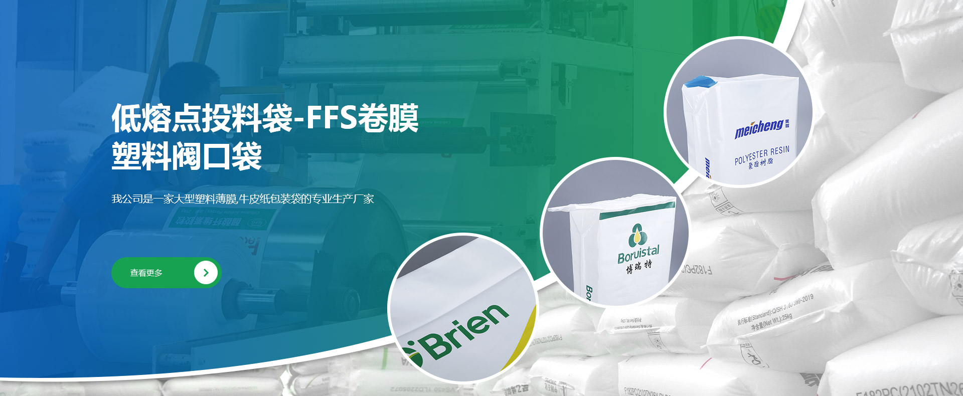 我公司是一家大型集塑料薄膜類、牛皮紙類產(chǎn)品研發(fā)、生產(chǎn)和銷售的專業(yè)廠家,公司產(chǎn)品大量出口國外。海陽市融昌塑編包裝有限公司創(chuàng)建于1998年,是專業(yè)研發(fā)、生產(chǎn)和銷售低熔點橡膠投料袋、EVA閥口袋、LDPE多層閥口袋、EVA/LDPE低熔點膜、橡膠包裝膜、FFS重包裝袋、普通塑料包裝袋、牛皮紙閥口袋等產(chǎn)品的綜合包裝類企業(yè)。公司坐落于中國.山東省煙臺海陽市,地處黃海之濱,位于青島、煙臺、威海三市的中心地帶,交通發(fā)達占地面積35000㎡,固定資產(chǎn)8000萬...